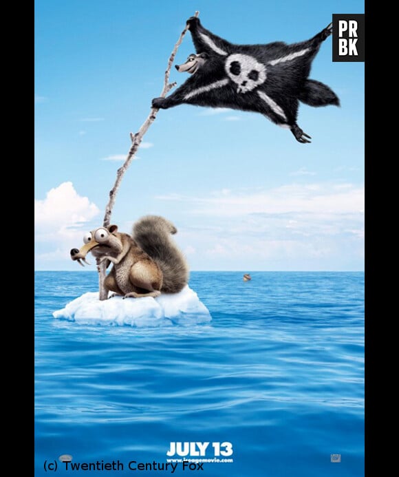 Sur l'affiche du film L'Age De Glace 4, on peut voir Scrat en premier plan. Il est sur un bout de glace qui flotte sur la mer. Il tient dans les pattes un drapeau de pirate, qui n'est autre qu'un animal applati.